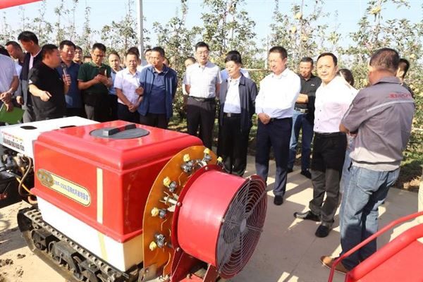 會議現(xiàn)場展示了果園開溝施肥、植保、除草、修剪套袋、采收、運輸、防災(zāi)等9大類30余臺機具;演示了防凍煙霧發(fā)生器、開溝施肥機、避障割草機、行間割草機、遙控打藥機、果園高空作業(yè)平臺、修剪機、果園無人車等21臺新機具。