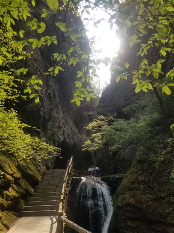 春日里的牛背梁,青山蒼翠,飛瀑直瀉而下。羚牛谷的木棧道旁,一棵棵樹木橫亙在棧道中間,生動體現(xiàn)了“人與自然和諧共生”。