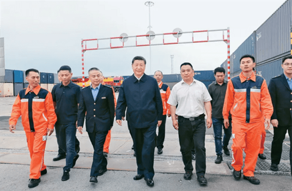 2024年4月22日至24日,中共中央總書記、國家主席、中央軍委主席習(xí)近平在重慶考察。這是22日下午,習(xí)近平在重慶國際物流樞紐園區(qū)重慶鐵路集裝箱中心站,同貨車司機(jī)、列車司機(jī)、裝卸工人、場站管理人員等親切交流。新華社記者 王曄 攝