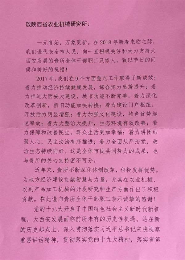 正值新春來(lái)臨之際,中共西安市委、西安市人民政府派員專程對(duì)我所進(jìn)行慰問(wèn)并送上新春的祝福,我們將一如既往地關(guān)注和支持大西安的發(fā)展,為我省農(nóng)機(jī)行業(yè)做出應(yīng)有的貢獻(xiàn)。