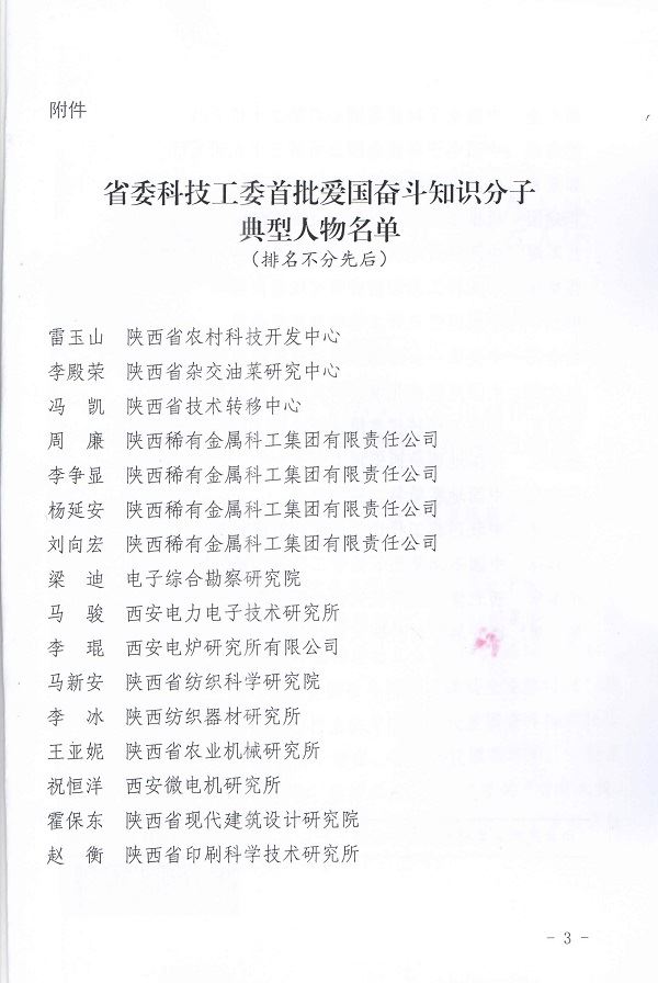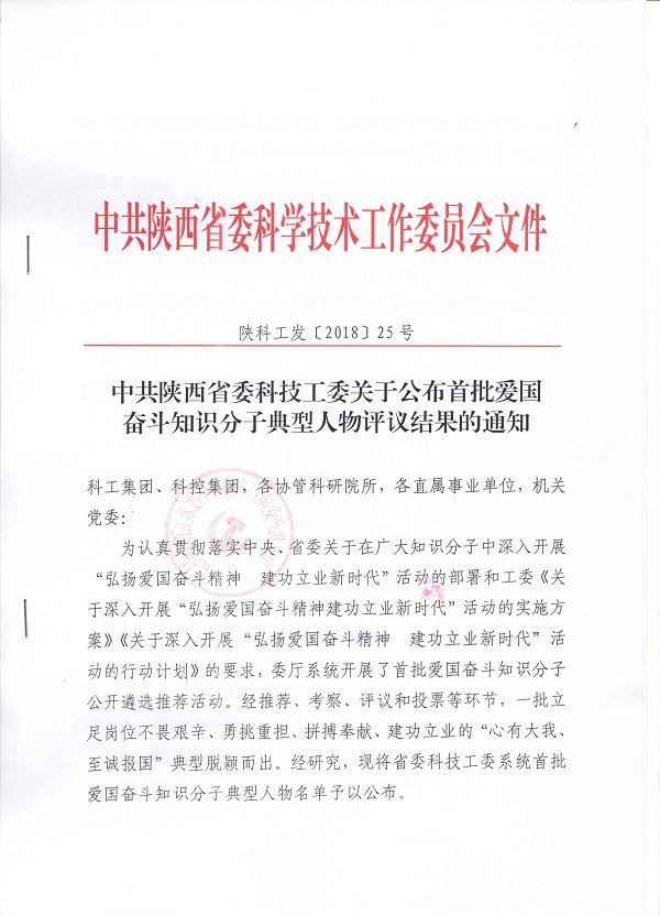根據(jù)《中共陜西省委科技工委關(guān)于公布首批愛(ài)國(guó)奮斗知識(shí)分子典型人物評(píng)議結(jié)果的通知》(陜科工發(fā)[2018]25號(hào))文件通知,我所總工程師王亞妮同志被評(píng)為省委科技工委系統(tǒng)首批愛(ài)國(guó)奮斗知識(shí)分子典型人物。